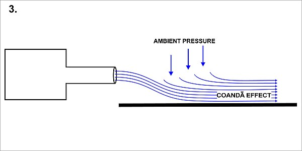 The open tube has no Coandă surface. Its exit is a turbulent, divergent plume. Some room air gets pulled in by shear-layer interaction at the turbulent boundary, which is a weak, disorganized entrainment mechanism compared to Coandă attachment along a designed surface. The tube moves maybe 50 SCFM total. Thirty-three of that is compressed air. The ratio is maybe 1.5:1. Compare 1.5:1 with 25:1.